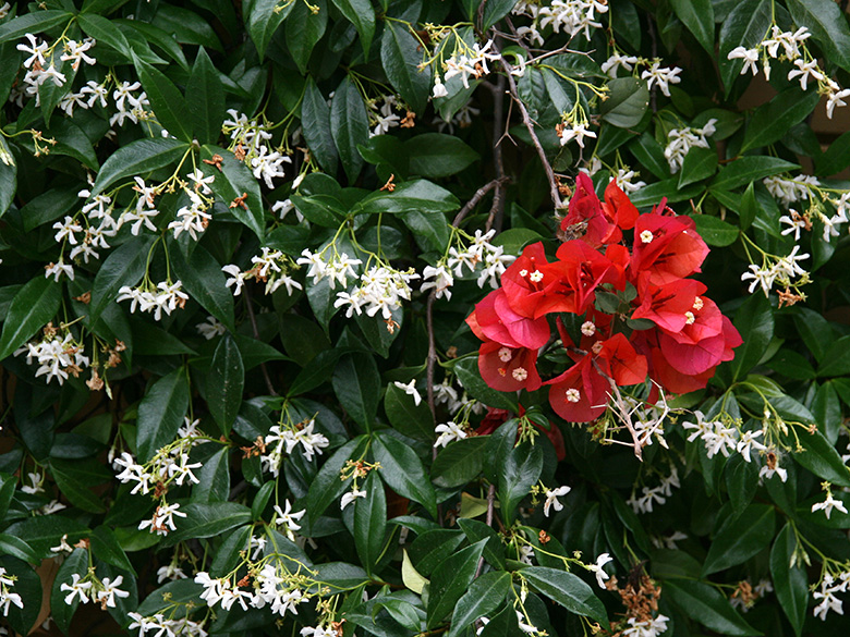 ![]() Trachelospermum jasminoides (mit/with Bougainvillea), Griechenland, Peloponnes, Korinthia, Korinth, gepflanzt (24.05.2012, © Gisela Nikolopoulou) |