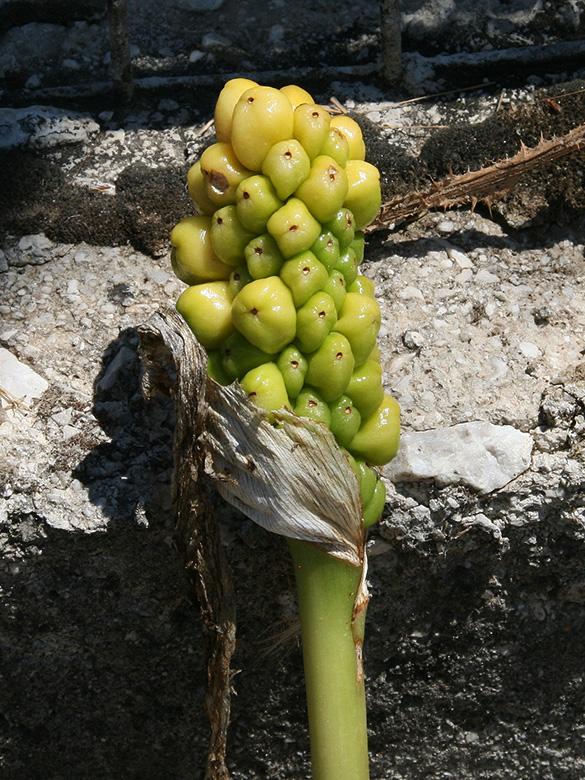 ![]() Arum italicum subsp. italicum, junger Fruchtstand/young infructescence, Griechenland, Peloponnes, Korinthia, Kyllini-Massiv (26.05.2014, © Gisela Nikolopoulou) |