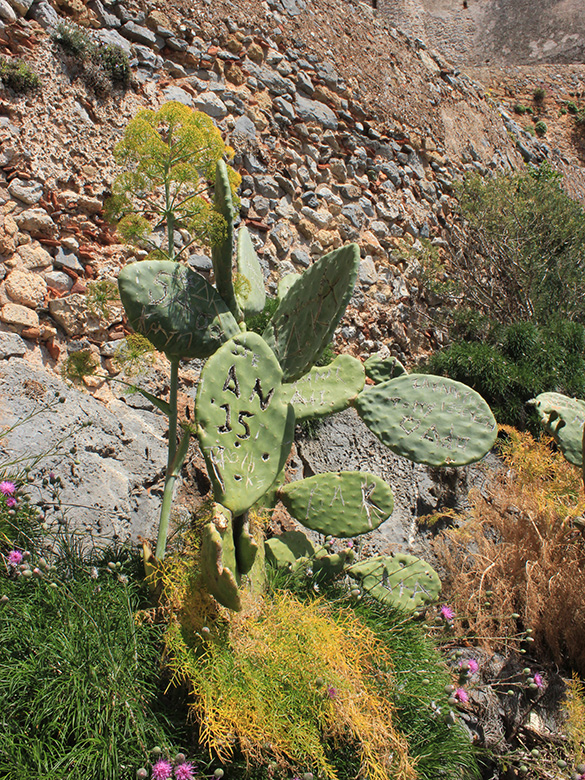 ![]() Opuntia ficus-indica, mit Ferula communis, Griechenland, Lakonien, Malea-Halbinsel, Monemvasia (27.04.2017, © Volker Unterladstetter) |