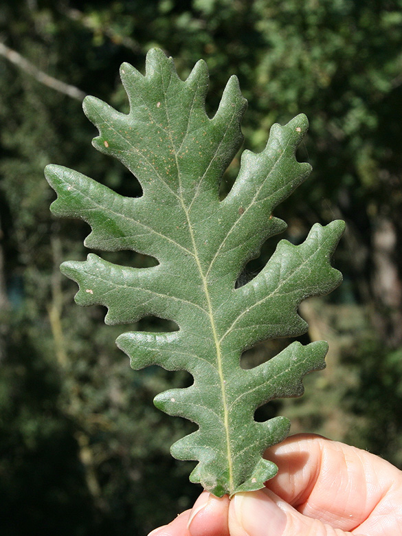 ![]() Quercus frainetto, Blattoberseite/leaf, upper side, Griechenland, Peloponnes, Korinthia, Aroania-Massiv, Limni Doxa (05.10.2021, © Gisela Nikolopoulou) |