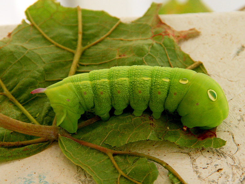 ![]() Riesenweinschwärmer (Theretra alecto) an einem Weinblatt (Vitis vinifera subsp. vinifera), Griechenland, Peloponnes, Korinthia, Korinth (12.04.2014, © Gisela Nikolopoulou) |